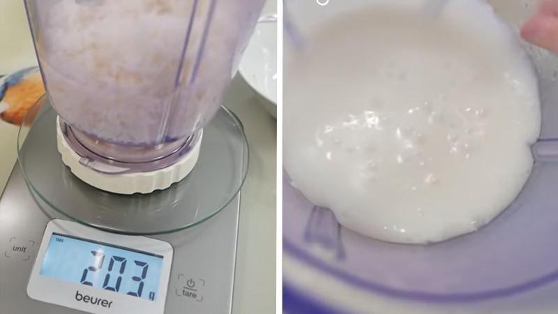 Đầu tiên, đặt 1 chén cơm nguội và 400ml nước lọc vào cối máy xay sinh tố và xay nhuyễn hỗn hợp. Sau đó, đổ hỗn hợp này qua rây để loại bỏ phần bã lớn. Nếu còn bã, bạn có thể đưa lại vào cối và thêm 100ml nước nữa. Tiếp tục xay nhuyễn hỗn hợp và lọc qua rây một lần nữa.